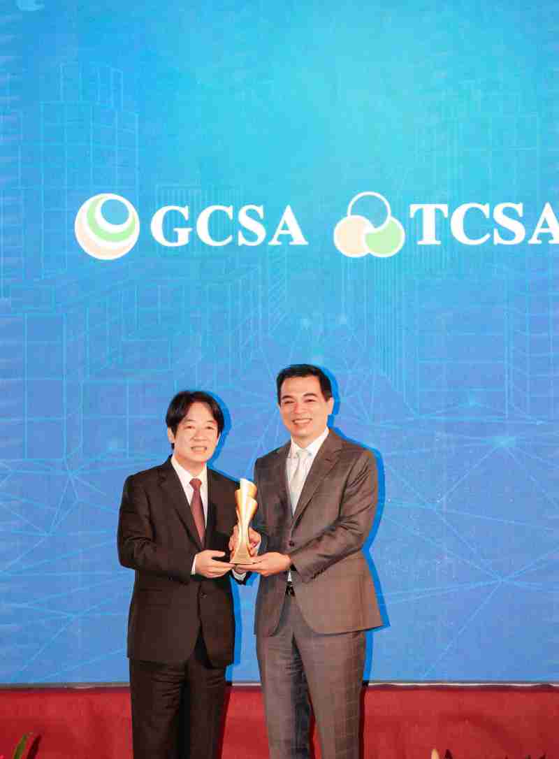 达全方位永续表现获全球永续奖及台湾永续奖肯定,,,,由副总统赖清德颁奖 (左),,,蓝狮在线总经理柯富仁 (右) 代表领奖
