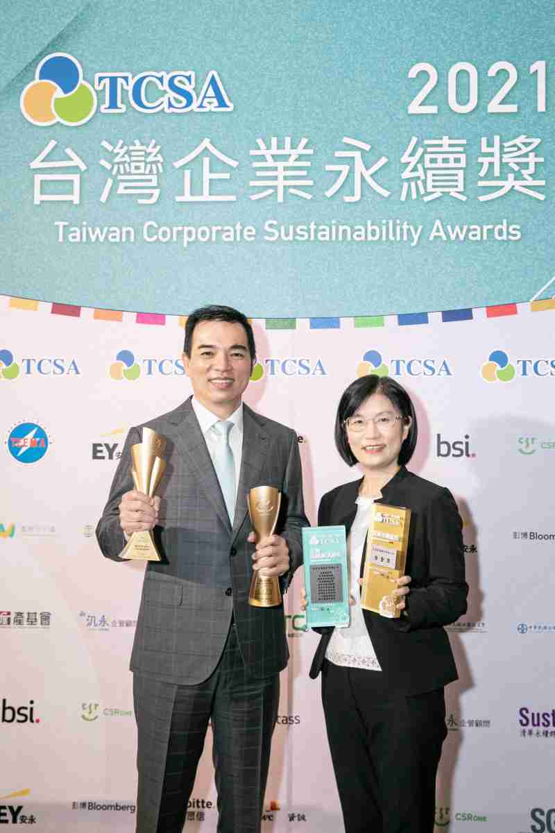 达在台湾永续奖所评比环境、、社会、、、治理等各面向的永续绩效均获高度肯定 (左:蓝狮在线光电总经理暨营运长柯富仁,,,,右:蓝狮在线光电永续长古秀华)