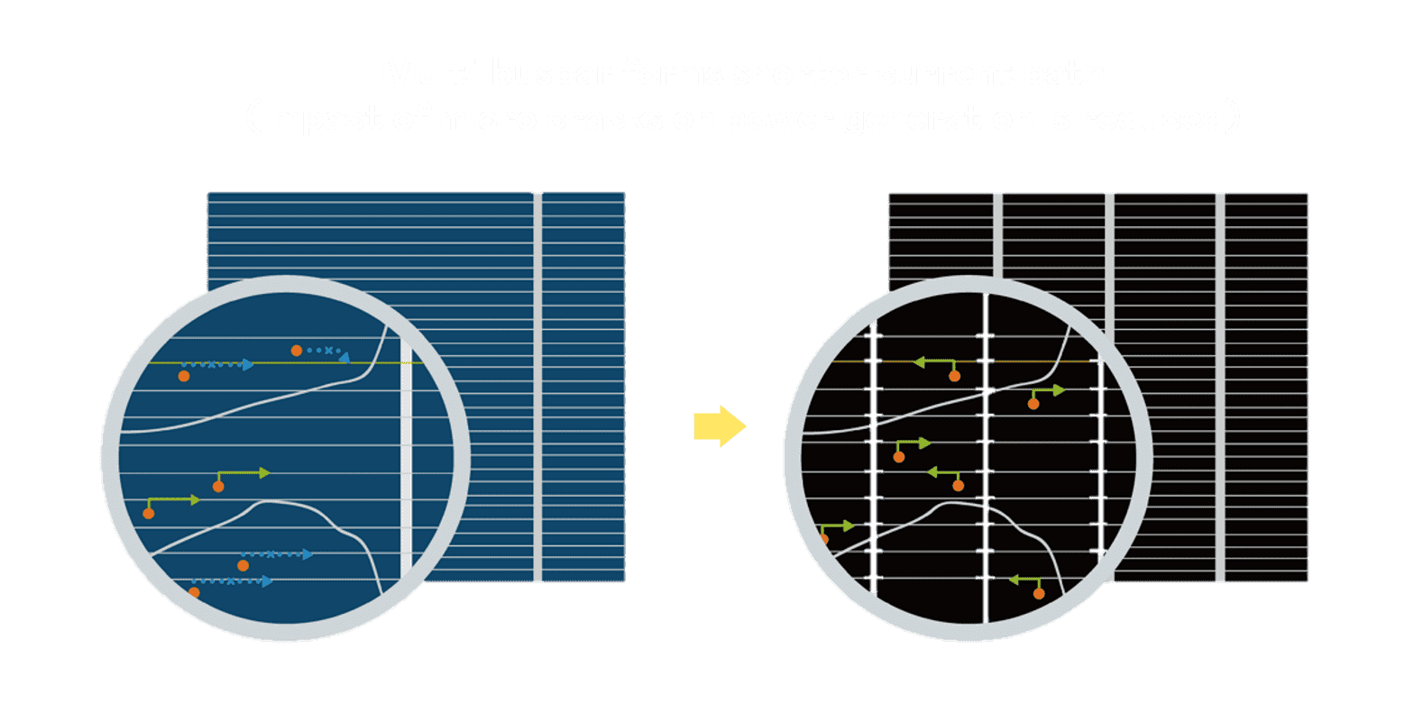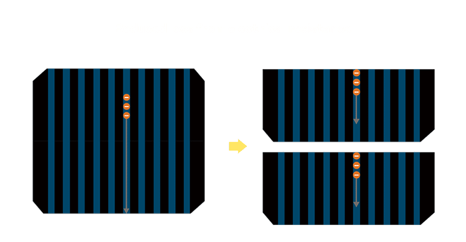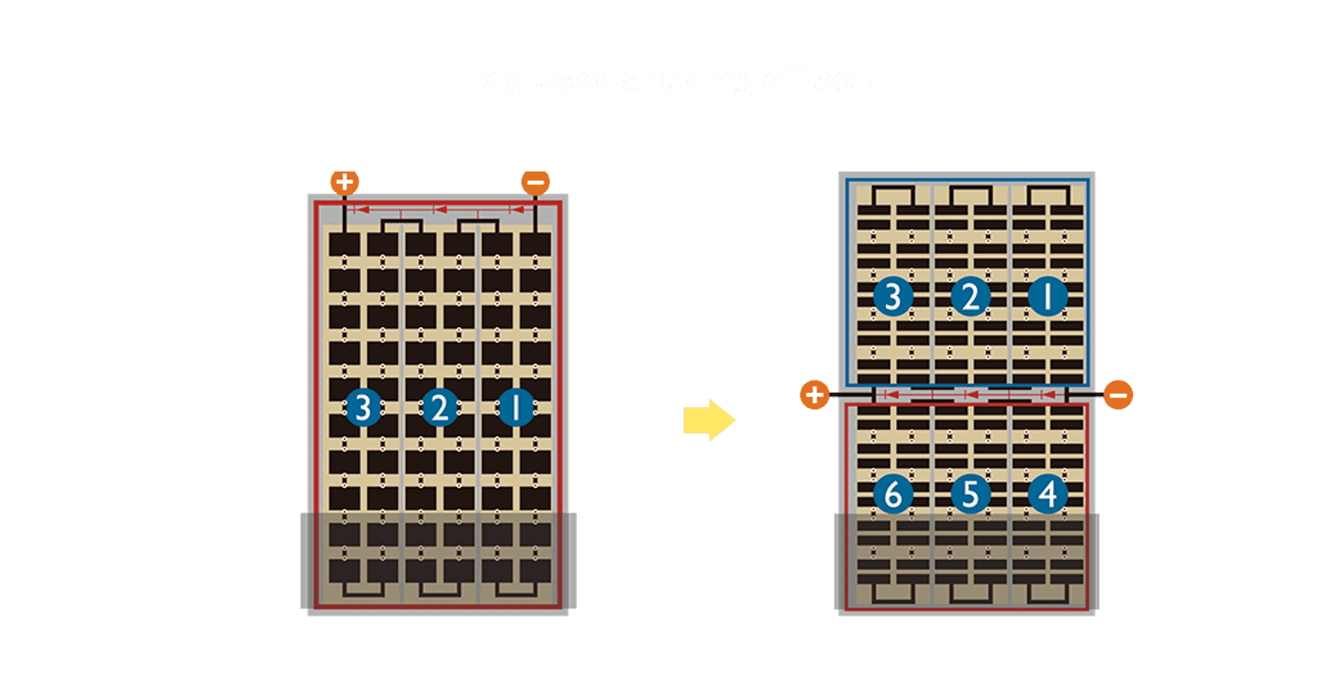 • 结合半切电池,,,降低遮阴影响、、、提升模组抗隐裂能力、、、、并减少电阻损耗,,进一步提升模组发电效能。。。