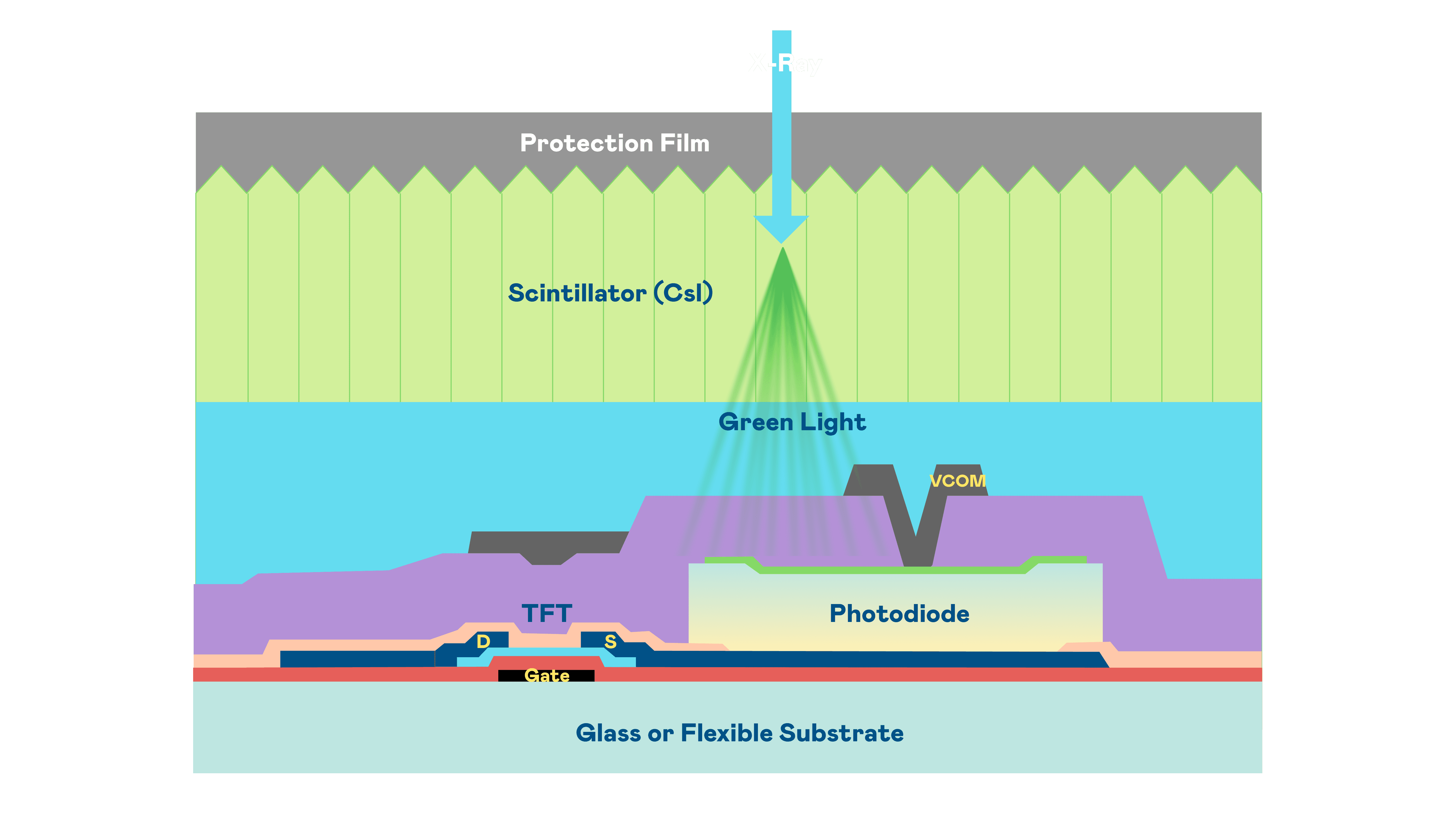 蓝狮在线的X光影像感测阵列使用薄膜电晶体 (TFT) 作为每个像素的读取开关,,,,搭配光电二极体(Photodiode)的光电转换元件,,,,用以感测X光影像讯号。。。。